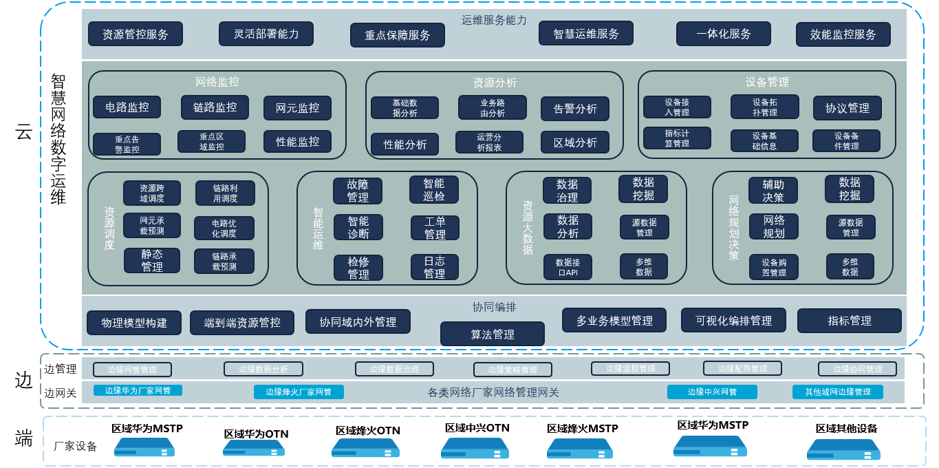随着业务场景多样化的增加,域间复杂场景算路策略增加,对于跨域、跨多域的网络复杂场景,需要加快多域协同智能管理,以满足不同策略的业务路径预计算能力,跨域EoS业务场景、跨域OTN业务等,满足自动配置业务还原及纳管,实现工单流程系统智能联动,开放协同网络能力。同时,对于区域内跨地市的业务需求实现分业务、分层次、分权分域式管理。