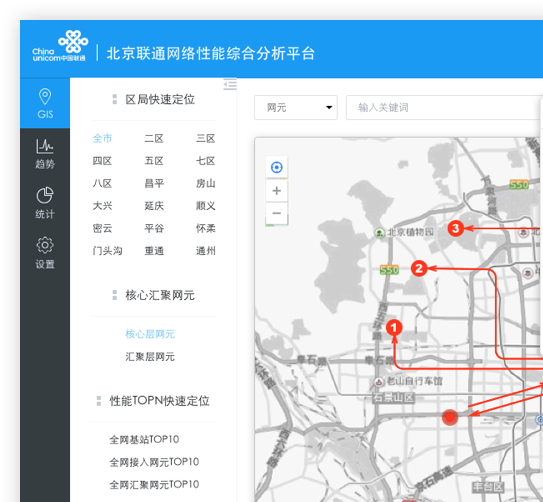 网络性能综合分析平台主要是对运营商各类传输网性能与负荷情况进行呈现、统计与趋势分析。平台结合GIS模块呈现网元、信源设备物理位置及性能信息,展现区局、汇聚区区域性信息;设备、业务链路的性能趋势展现;结合大数据分析引擎支持网络秒级性能统计分析功能,以及定制化搜索引擎等。