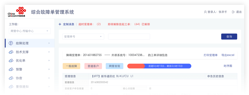 综合调度系统是负责处理故障业务工单、中继业务开通工单的流转系统,,负责工单处理的信息化支撑和全过程控制管理。在故障业务工单方面,系统不仅能够处理由各级网络监控部门和传输、数据、无线、公话等网管系统主动发现的故障,同时还可以处理综合客服系统接受到的外部客户故障申告;在中继业务开通工单方面,实现了局内电路申请、调度的电子化、集中化管理,建立了交换、传输、数据、光纤专业电路的申请、调度、施工、测试流程